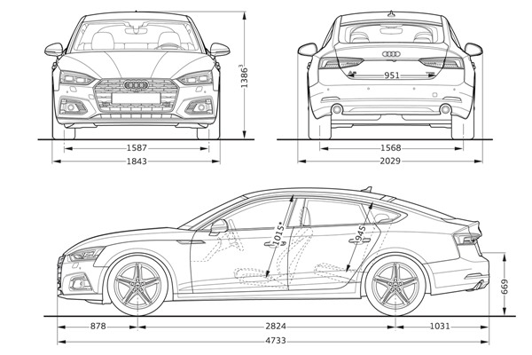 아우디 A5 스포츠백 크기는 전장 (4,733mm), 전폭 (1,843mm), 전고 (1,386mm), 휠베이스 (2,824mm) 크기입니다. 아우디가 지목한 BMW 4 시리즈 크기 전장 (4,640mm)/ 전폭 (1,830mm), 전고 (1,365mm) 보다 큰 차체를 적용했습니다.