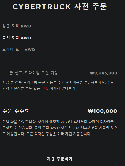 그럼에도 가격은 39,900달러 시작 가격에 미국 사전 계약은 100달러에 신청할 수 있고, 국내는 10만 원에 사전계약을 할 수 있도록 테슬라 코리아 홈페이지에서 간단하게 진행할 수 있죠.