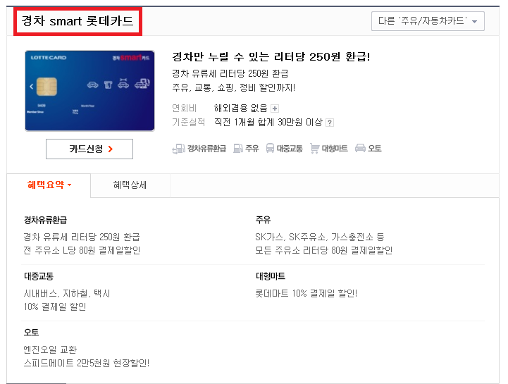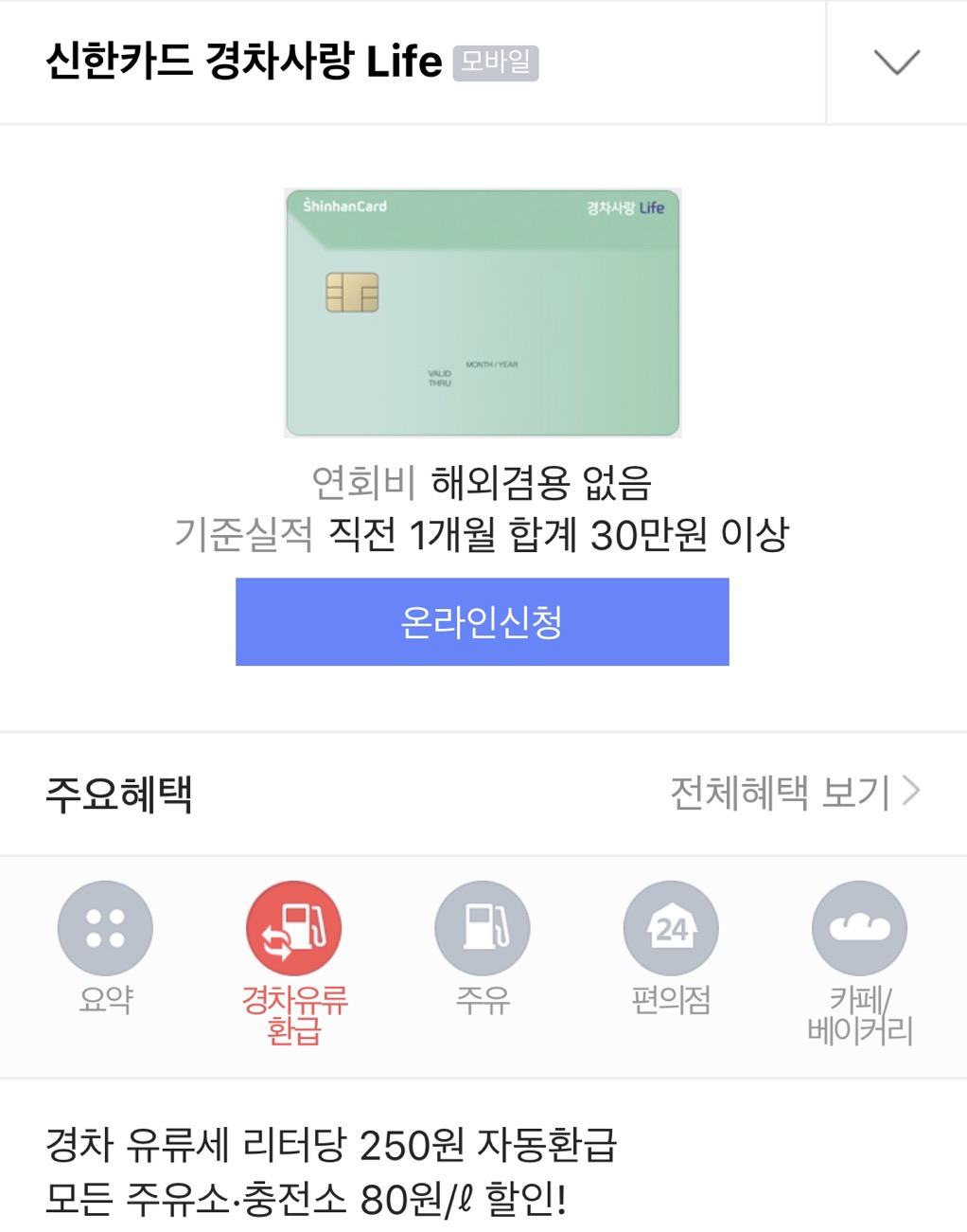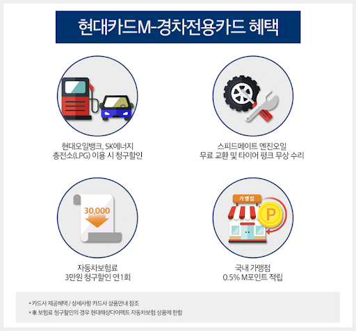 - 신한/롯데/현대 경차 사랑카드 발급으로 리터당 250원 유류세 할인.
