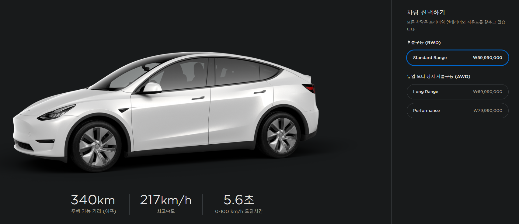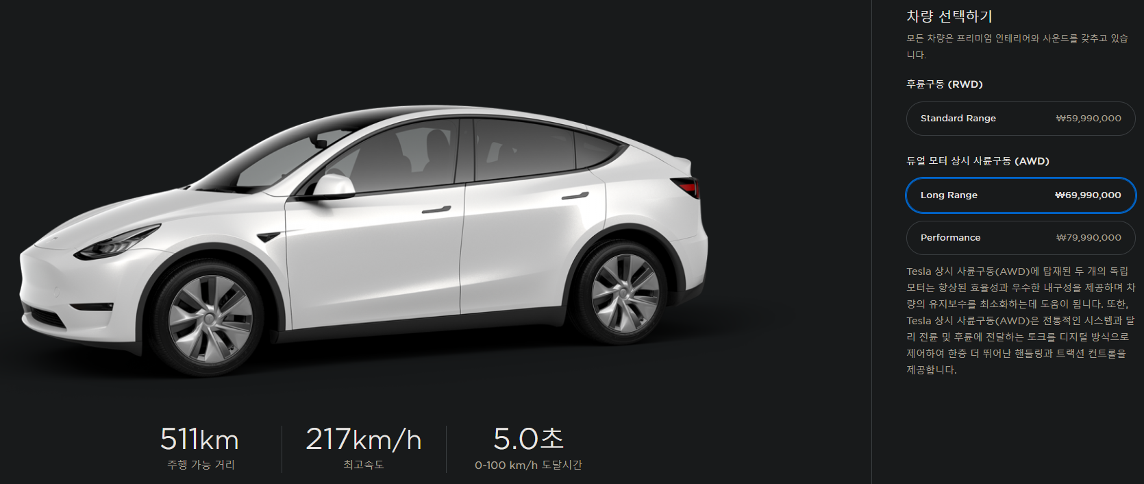 테슬라 모델y 롱레인지 가격 : 6,999만 원 출시 가격으로 사륜구동, 최고출력 351마력 (258kW), 최대토크 53.7kgm, 255/45 R19.