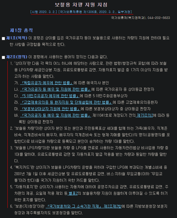 국가유공자 차량구입혜택 핵심 내용을 참고하면 보철용 차량 지원 지침 제1조와 제2조를 확인하면 해당자의 혜택을 쉽게 알 수 있습니다.