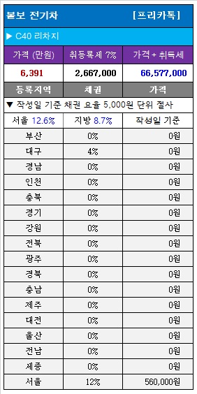 따라서 서울에서 볼보 C40 리차지 구매에 66,577,000원이 발생하고 추가적으로 56만 원 채권 할인 비용까지 합한 총 67,137,000원 비용이 발생합니다.
