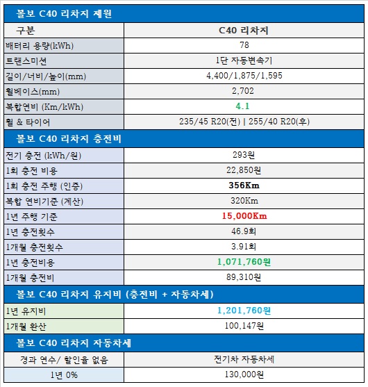 그럼 볼보 C40 리차지 유지비 정보를 검토해 볼까요?