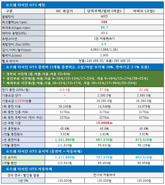 위 이미지 포르쉐 타이칸 GTS 연비가 아직 나오지 않아, 인증 받은 317Km 주행 기준 복합연비를 적용하여 산출한 내용입니다.