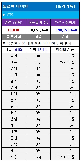 다행히, 포르쉐 타이칸 터보 가격보다는 저렴한 가격입니다. 국내 출시한 포르쉐 타이칸 GTS 가격은 18,030만 원에 출시하였고 이를 세금을 포함한 가격 정보를 확인하면 아래 이미지를 참고할 수 있습니다.
