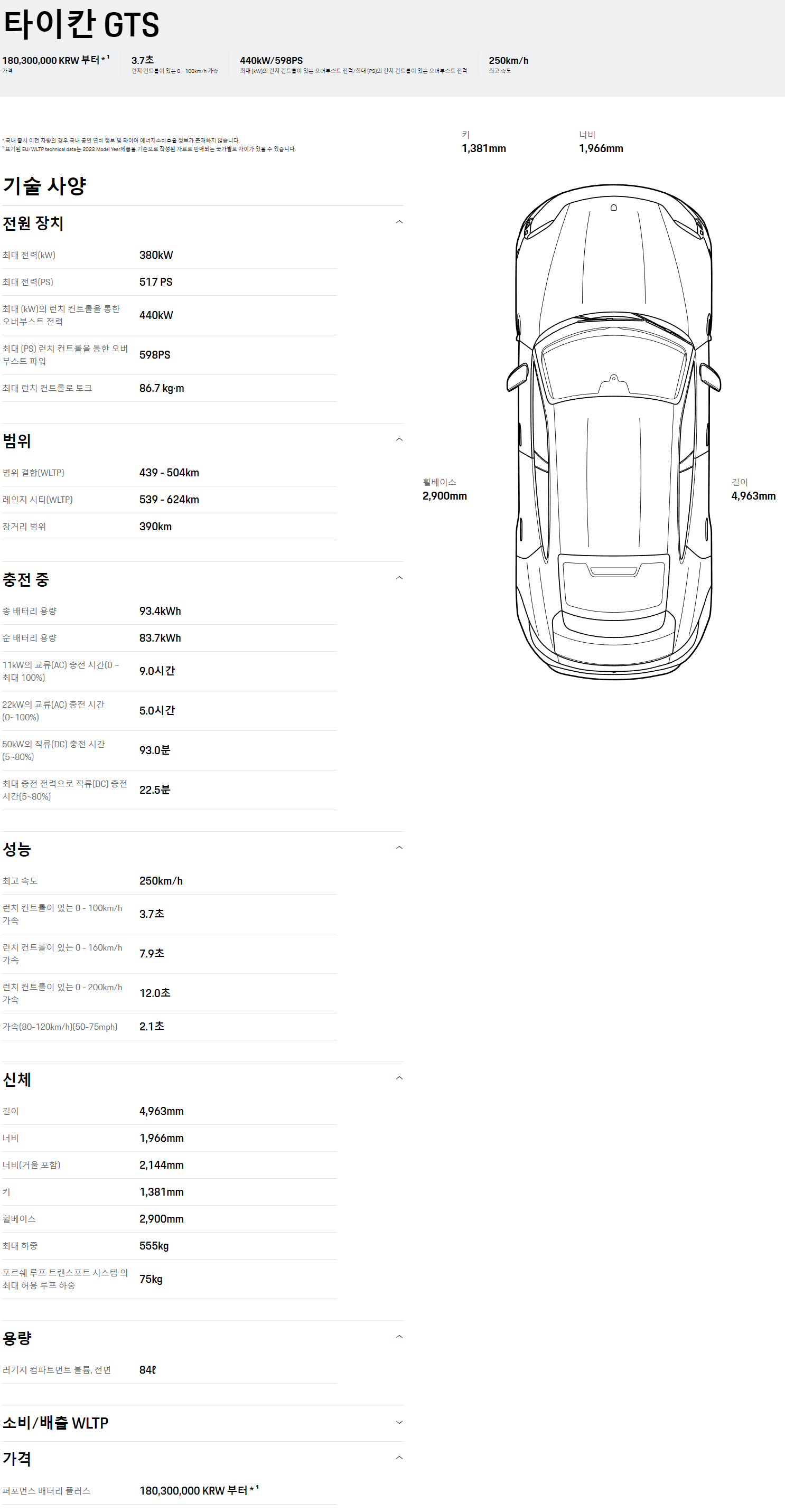 국내 출시에 포르쉐 코리아에서 타이칸 GTS 제원을 공개하고 있습니다. 그 부분을 캡처해서 자세하게 전달한다면 아래 제원을 참고할 수 있습니다.