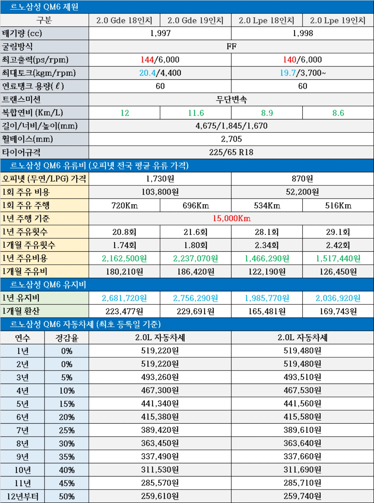 1년 유지비 차이가 약 70~72만 원 차이가 납니다. 이러니 성능과 옵션 차이 없는 QM6 선택은 LPG 파워트레인을 선호하는 것이겠죠.