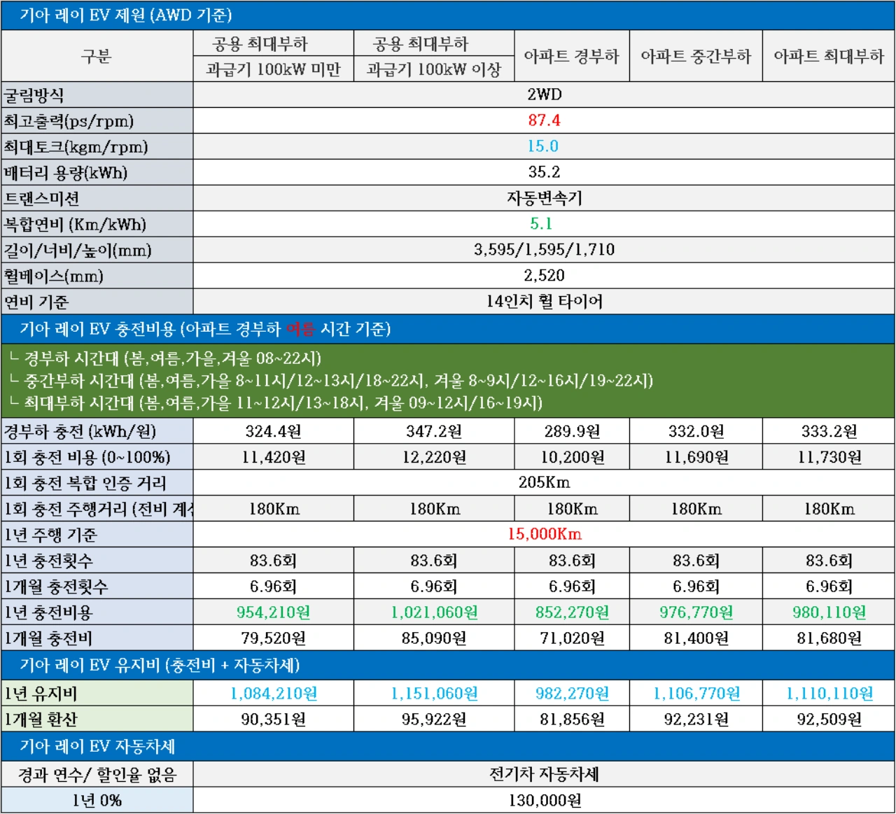 문제는 기아 레이 EV 보조금 이겠죠. 동급 모델(미니 전기차)을 참고하면 꽤 높은 수준의 보조금을 참고할 수 있지만 기아 레이 보조금은 아직 확정되지 않은 관계로 차후 보조금을 올리도록 하겠습니다. 그럼 전체적인 비용을 검토해 보았으니 충전비용과 자동차세를 검토해보죠.