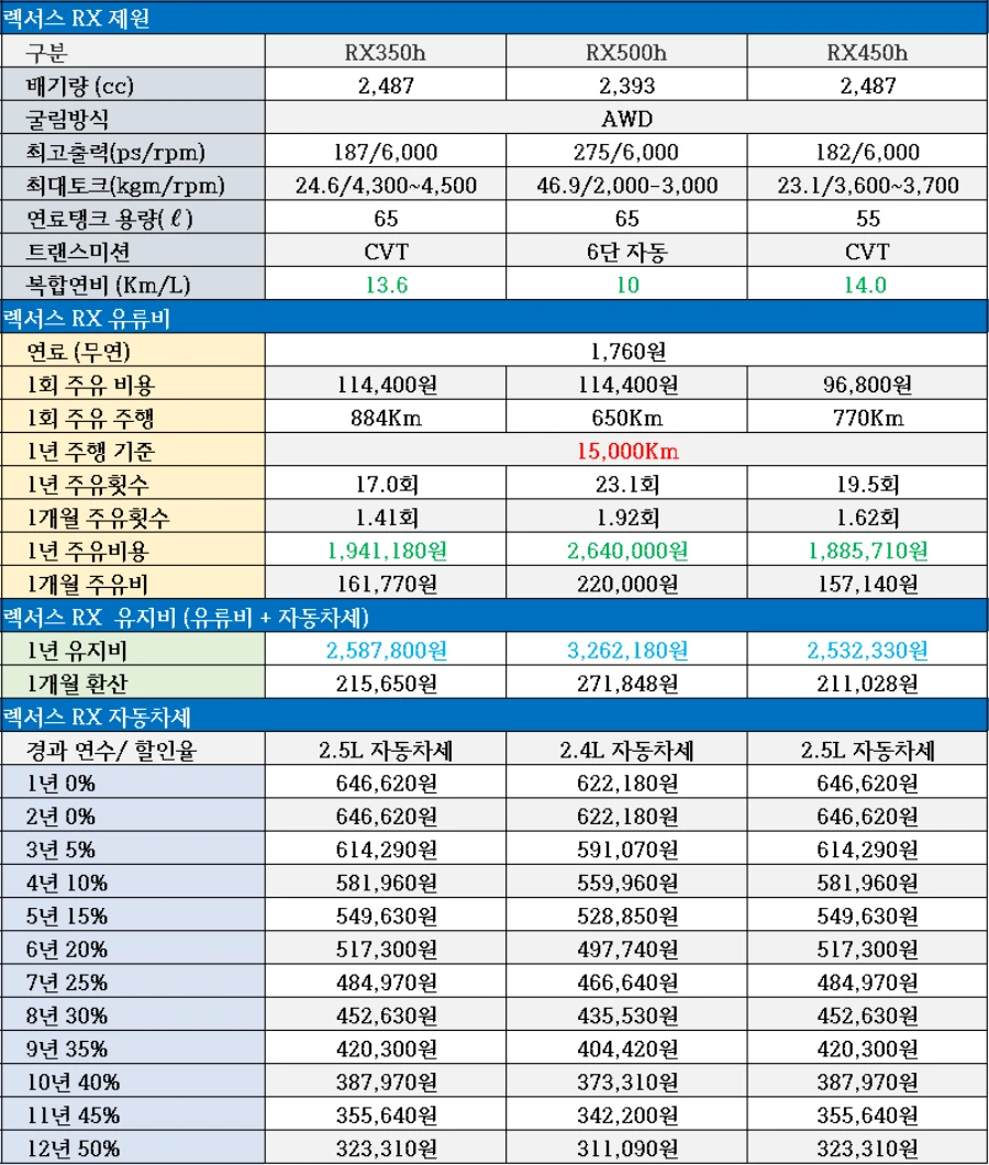 그럼, 경제성을 둔 렉서스 RX350h, 또는 RX450h 선택은 아래 유지비를 참고하면 쉽게 선택할 수 있겠죠.