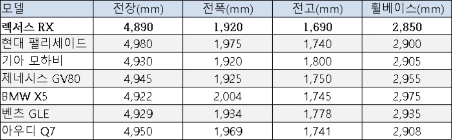 렉서스 RX 풀체인지 모델과 비교할 수 있는 경쟁 모델을 참고하면 대략 차체 크기를 가늠할 수 있을 것 같습니다. 제네시스 GV80, 벤츠 GLE, BMW X5 등 다양한 차량을 참고할 수 있죠.