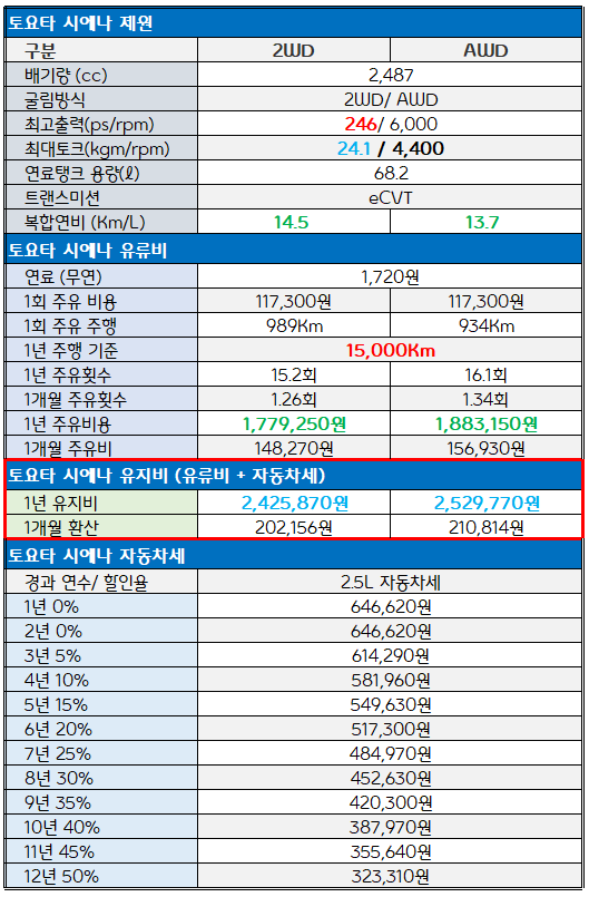 2025 토요타 시에나 하이브리드 가격 세금 유지비
